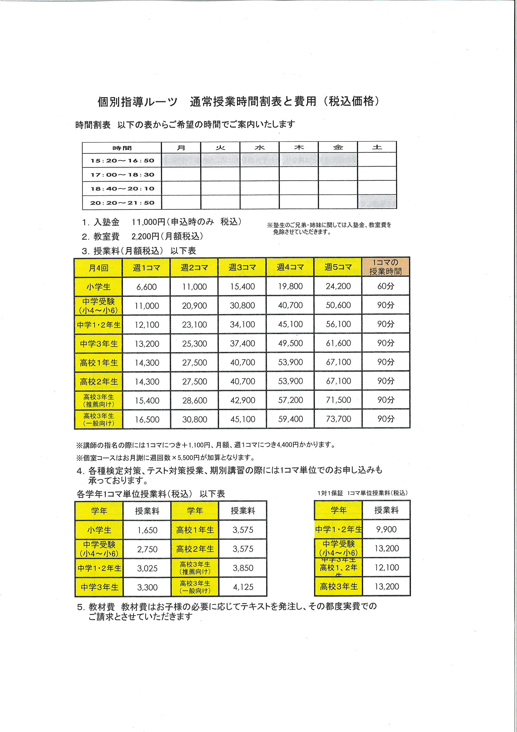 個別指導ルーツ蕨校の授業料は以下のようになっております。
